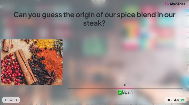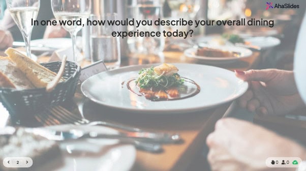 Az AhaSlides segítségével az vendéglátóipari vállalkozások valós idejű, érdemi visszajelzéseket gyűjthetnek interaktív prezentációk segítségével, amelyeket a várakozási idő alatt tartanak. Gondoljon rá úgy, mint visszajelzésre + történetre + fejlődési lehetőségre – mindezt egyetlen mobilbarát QR-élményen keresztül.