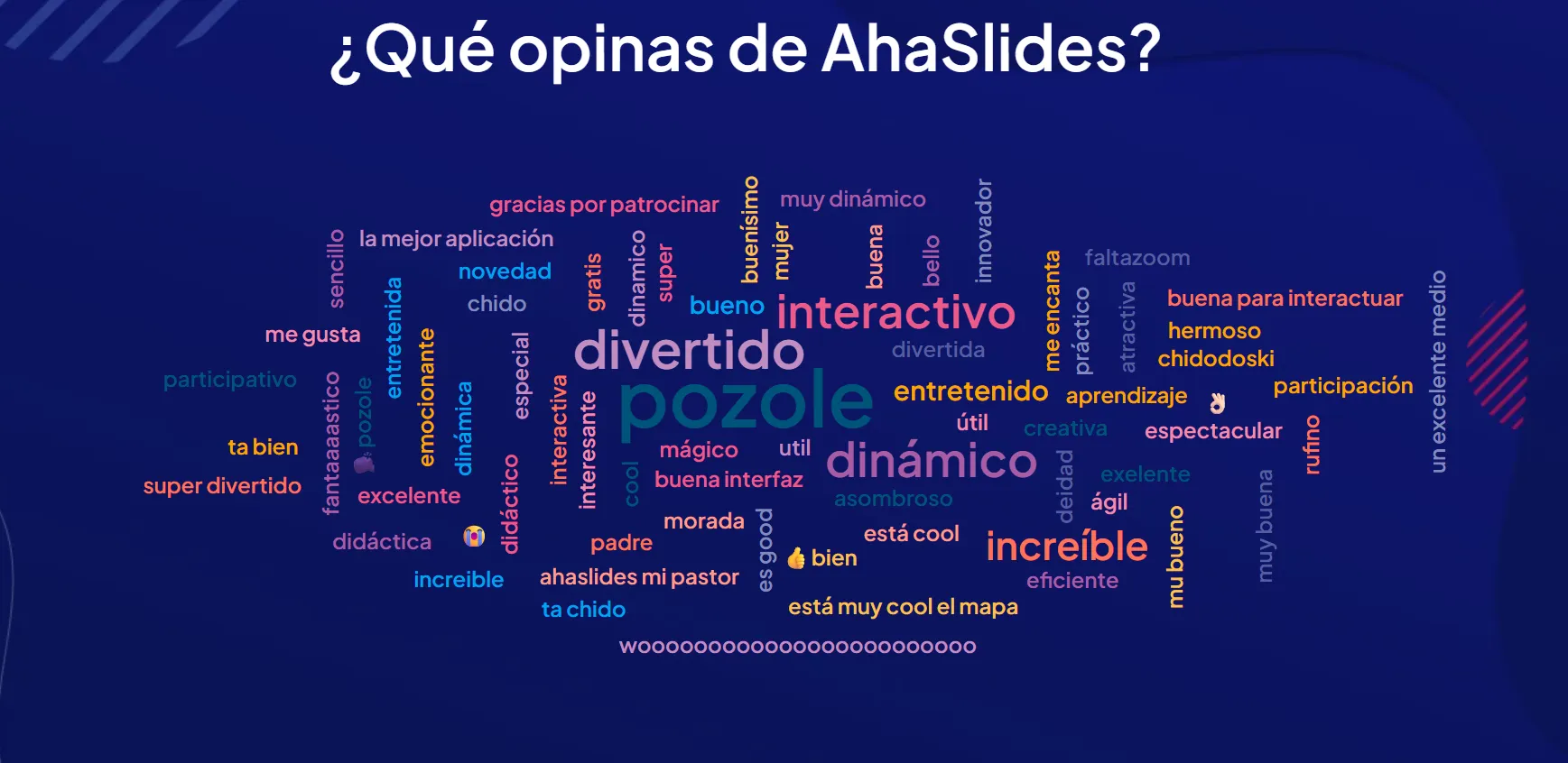 Az ülés végén arra kérte a résztvevőket, hogy írjanak le egy szóval az AhaSlides-szal kapcsolatos tapasztalataikat. A megjelenő szófelhő világosan elmesélte a történetet – a közönség interaktívnak, dinamikusnak, szórakoztatónak, részvételen alapulónak, innovatívnak, didaktikusnak és hihetetlennek nevezte.