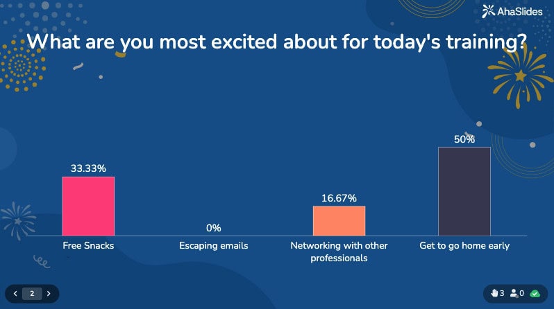 - Training session warmups — Facilitators use live polls to gauge participant energy, prior knowledge, and learning preferences, then adapt training delivery accordingly whilst making participants feel heard from the outset.