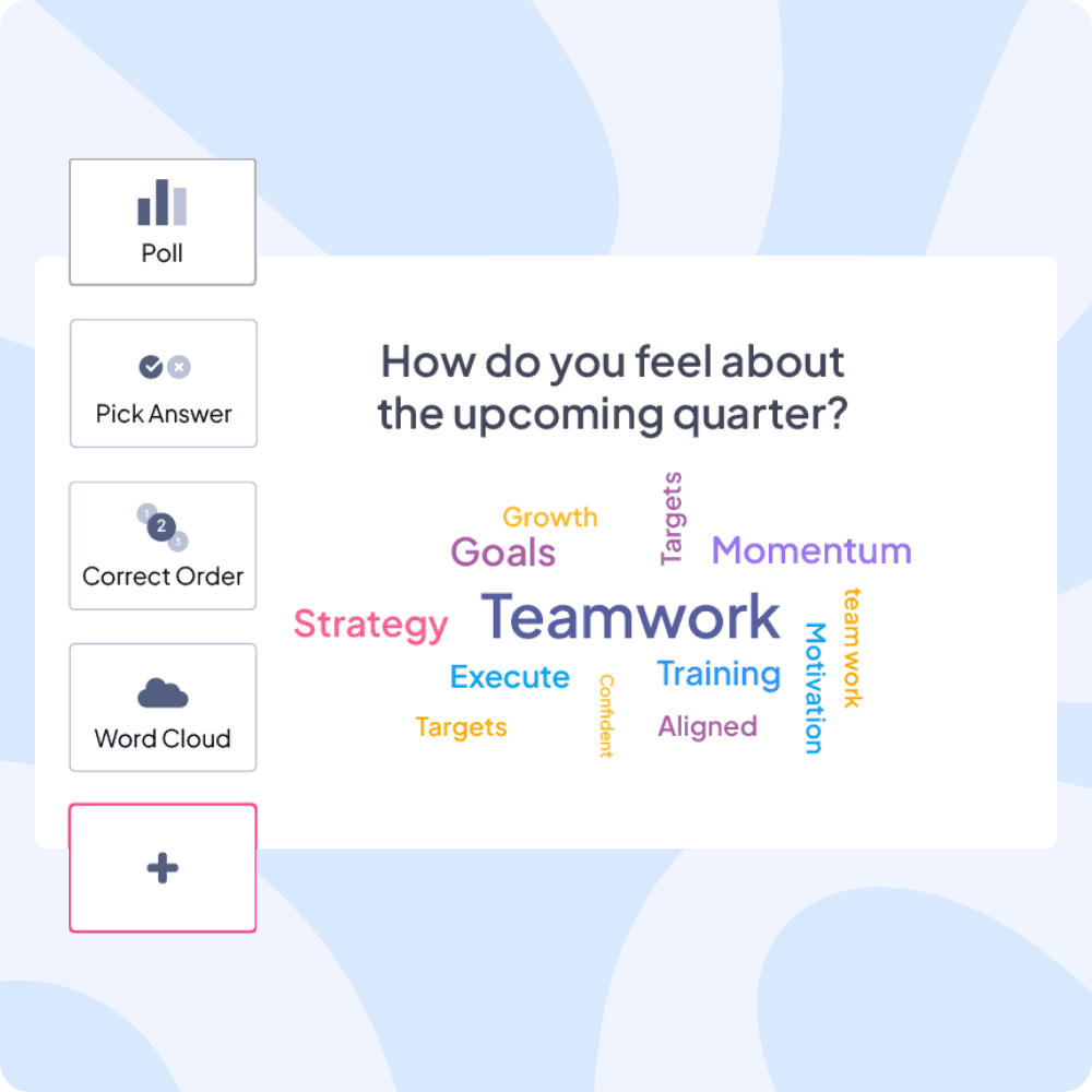 În timp ce concurenții se concentrează pe funcții individuale sau se specializează doar în chestionare, AhaSlides combină sondaje live, chestionare interactive, sesiuni de întrebări și răspunsuri, nori de cuvinte și multe altele într-o singură platformă perfectă. Nu este nevoie să jonglezi cu mai multe instrumente sau abonamente - tot ce ai nevoie se află într-un singur loc.