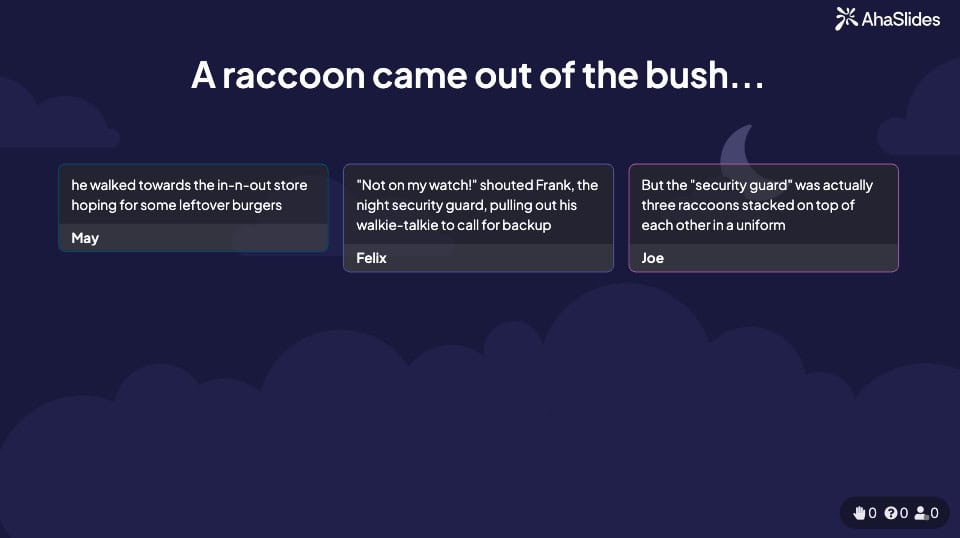 Börja först med en uppmaning, kanske en halv mening som "grodan kom ut ur dammen...". Efter det, nominera någon att lägga till lite till historien genom att skriva deras namn i chatten. När de är klara kommer de att nominera någon annan och så vidare tills alla har bidragit till historien.
