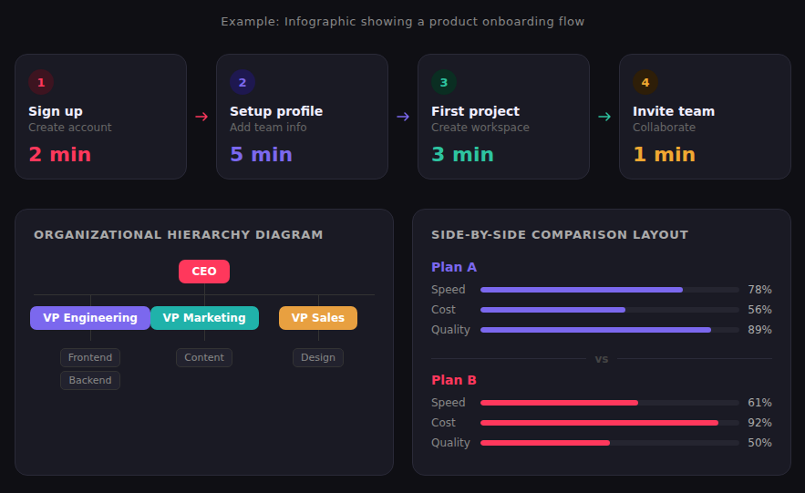 Đồ họa thông tin hữu ích nhất khi nội dung của bạn có cấu trúc mà văn xuôi khó diễn tả: một quy trình nhiều bước, sự so sánh giữa các lựa chọn, một hệ thống phân cấp, một dòng thời gian hoặc một tập dữ liệu có mẫu hình đáng để thể hiện. Những đồ họa thông tin tốt nhất sử dụng biểu tượng, màu sắc và văn bản tối thiểu để làm cho cấu trúc đó hiển thị ngay lập tức. Sai lầm phổ biến nhất là cố gắng nhét mọi thứ vào một đồ họa duy nhất. Một đồ họa thông tin đòi hỏi phải đọc kỹ lưỡng đã thất bại. Nếu người xem cần phải nghiên cứu nó, hãy đơn giản hóa nó.